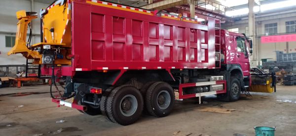 多功能除雪車是在ZZ3251M3649W型6*4自卸汽車的基礎(chǔ)上,加裝除雪裝置和融雪劑撒布裝置開發(fā)研制的集多種于一身的特種用途車輛,主要用于道路除雪、運(yùn)輸積雪、渣土(污泥)清運(yùn)等作業(yè),整車結(jié)構(gòu)布局合理,操作方便、簡(jiǎn)單、鏟雪和拋灑融雪劑的作業(yè)效率高,調(diào)節(jié)范圍廣,特別適合于國內(nèi)外城市環(huán)衛(wèi)、公路、市政等部門使用。動(dòng)力強(qiáng)勁、除雪效率高。
